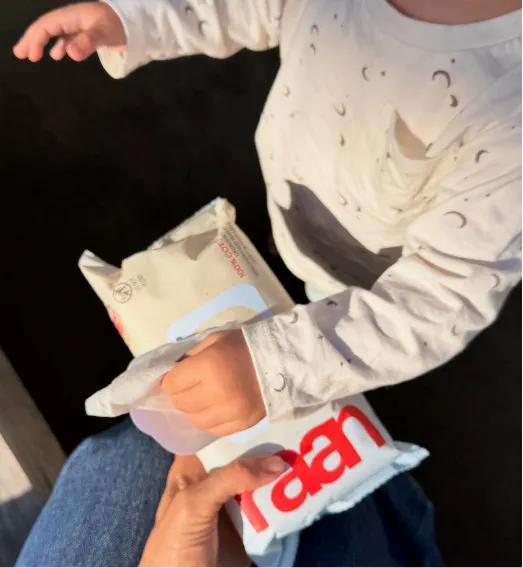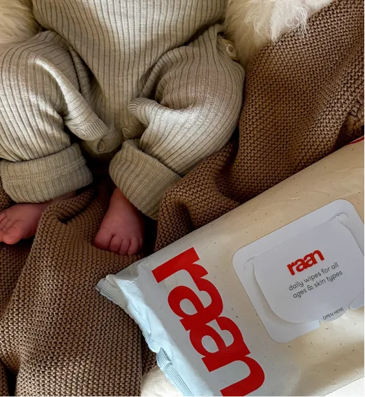 A. Raan wipes are made from unbleached, 100% cotton, not plastic fibers or heavily processed tree-based materials. They’re thicker, more durable, and designed with a minimal, thoughtful formula that works for sensitive skin and everyday messes.